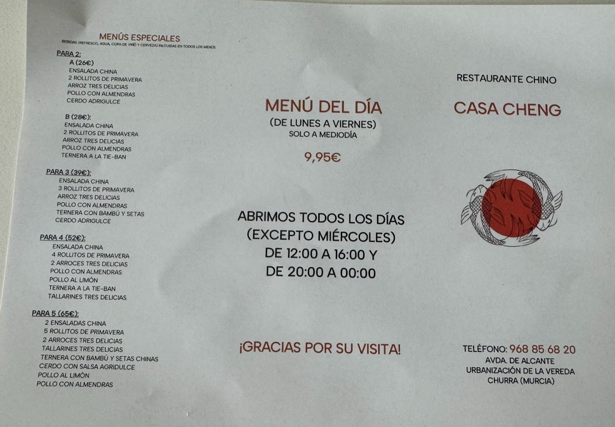 Welcome to Casa Cheng II, a charming Chinese restaurant nestled in Churra, Murcia. Renowned for its inviting ambiance and remarkable service, Casa Cheng II stands out for its affordability, making it a delightful choice for both quick bites and group gatherings. Patrons rave about the generous portion sizes and the exceptional quality of the dishes. The menu boasts traditional favorites like crispy spring rolls and flavorful three delight rice, each crafted with care and freshness. Diners particularly enjoy the chicken with almonds, celebrated for its tender meat and exquisite sauce blending eastern flavors brilliantly. The attention to dietary preferences, such as low-salt options, further enhances the dining experience. Overall, Casa Cheng II offers an unbeatable quality-to-price ratio, ensuring satisfaction on every visit. Whether you’re a local or just passing through, this gem is certainly worth a stop for an authentic taste of Chinese cuisine.